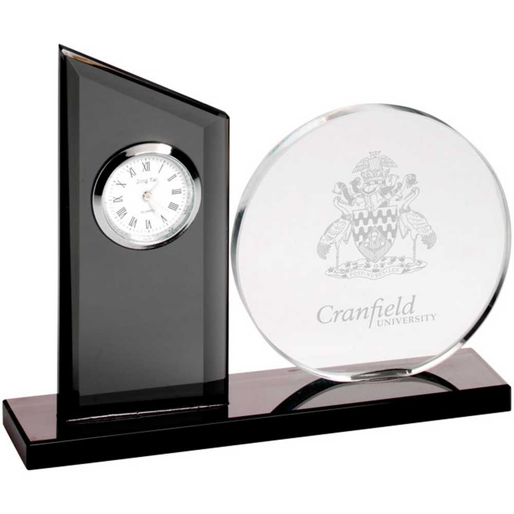 CLEAR/BLACK GLASS CLOCK AND ROUND PLAQUE