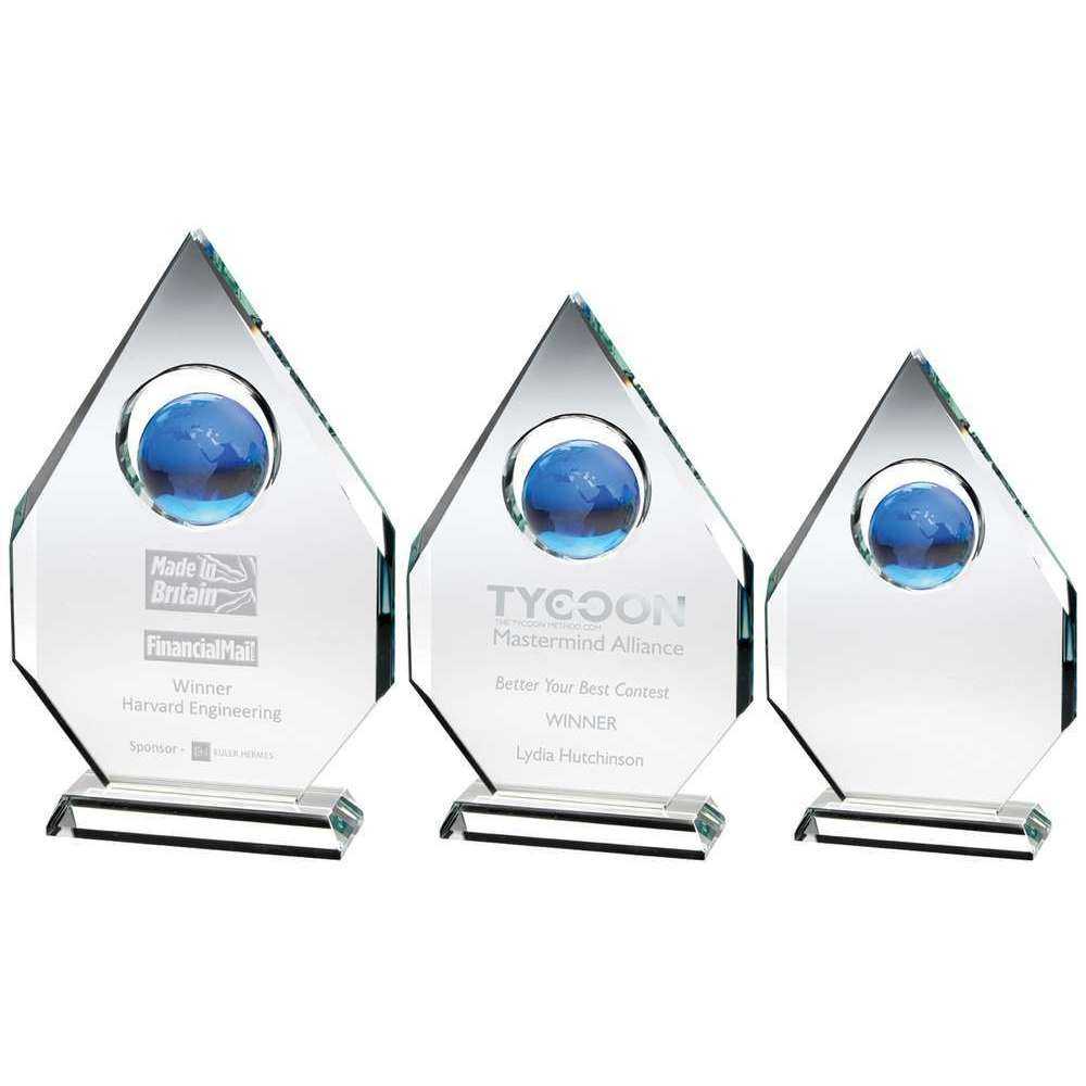 CLEAR GLASS DIAMOND PLAQUE WITH BLUE GLOBE