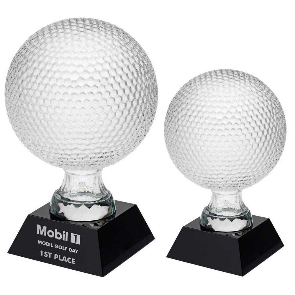 CLEAR GLASS GOLF BALL ON BLACK BASE