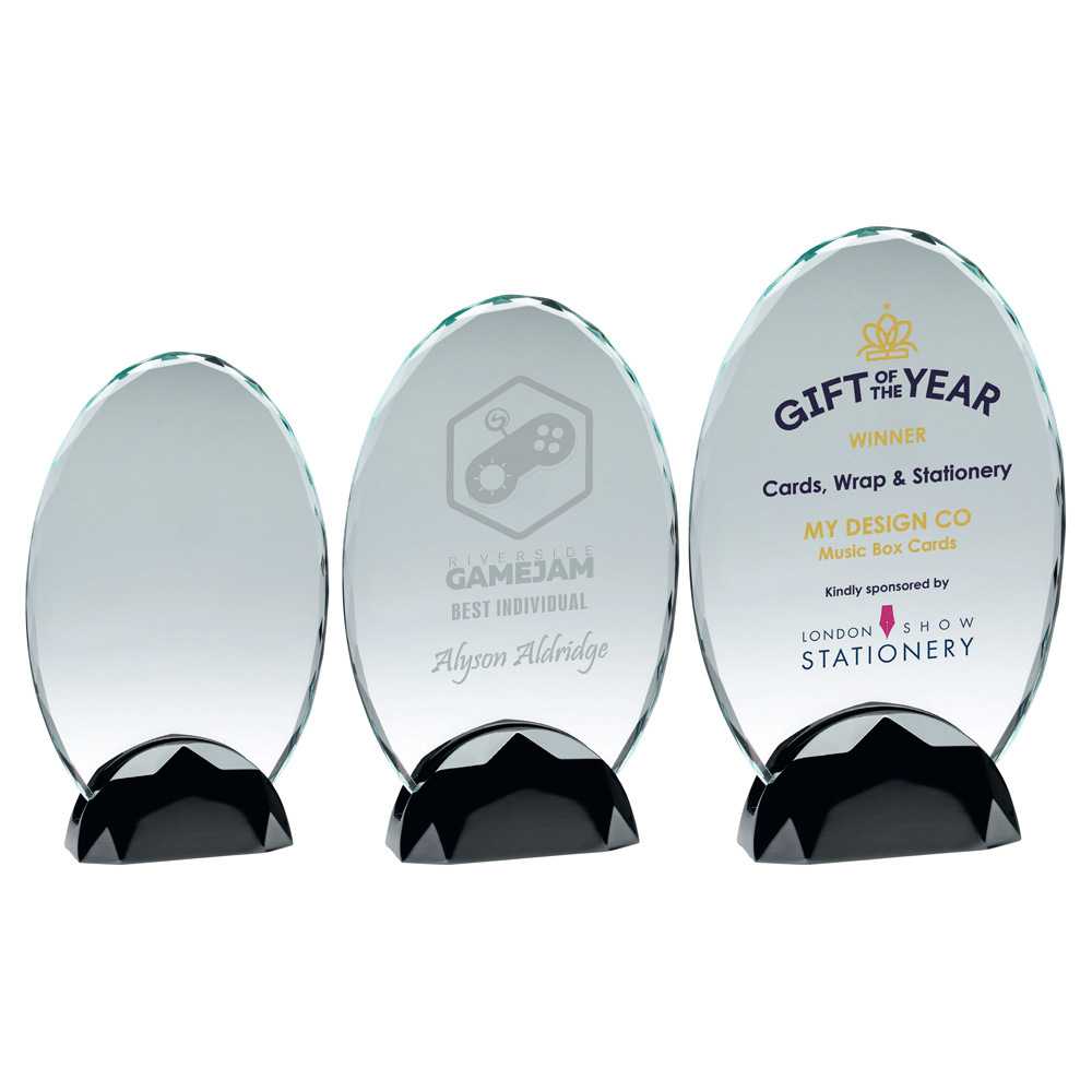 CLEAR GLASS OVAL PLAQUE (10mm THICK) IN GUN METAL BASE