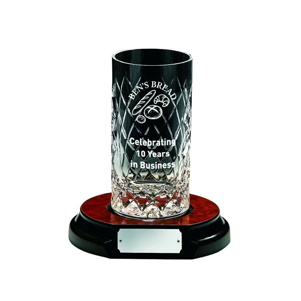 Two Full Cut Crystal Whisky Glasses on Wood Stand